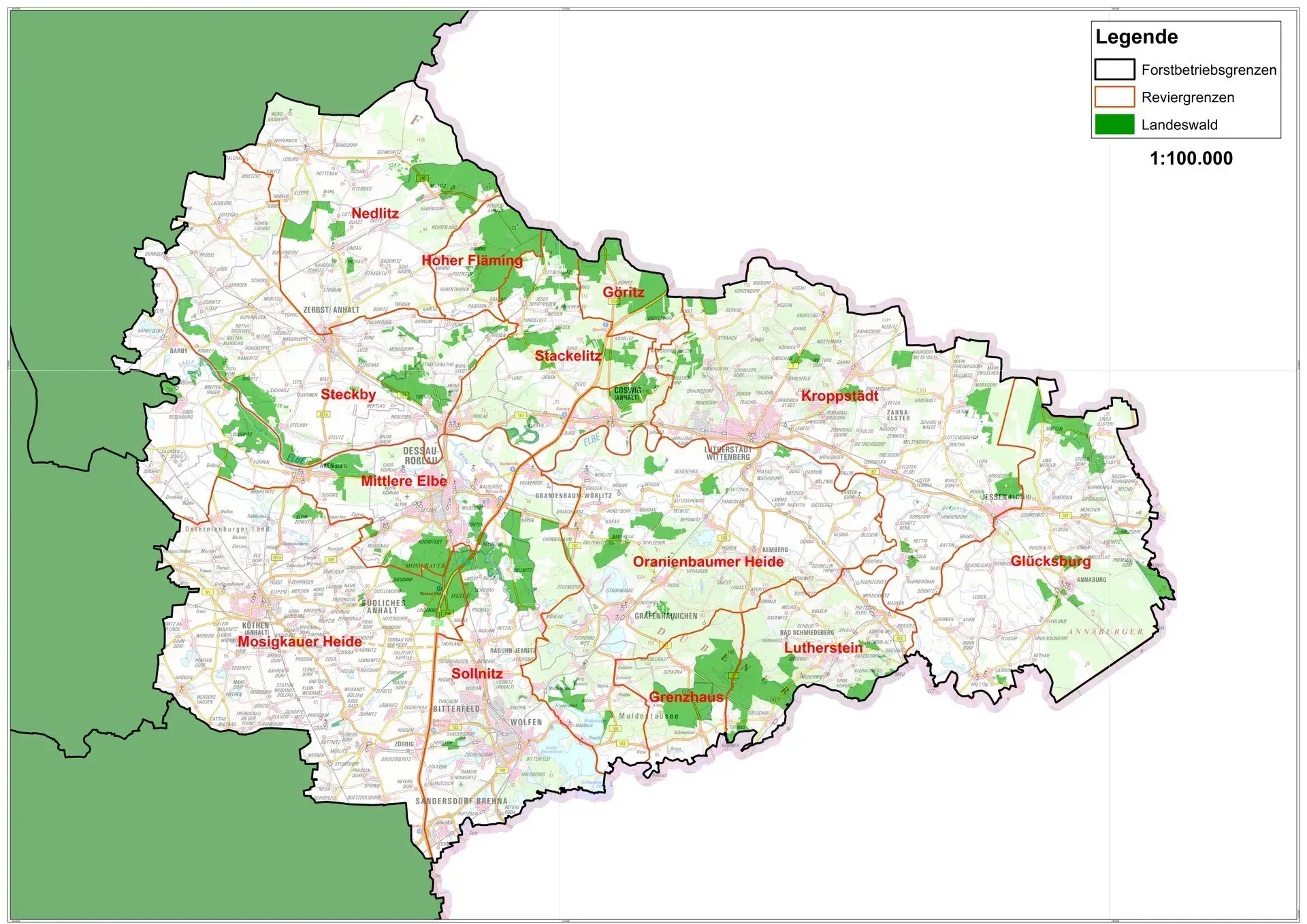 Der Forstbetrieb Anhalt erstreckt sich über den gesamten östlichen Teil des Landes Sachsen-Anhalt und umfasst die Landkreise Wittenberg, Anhalt-Bitterfeld sowie die Kreisfreie Stadt Dessau-Roßlau.