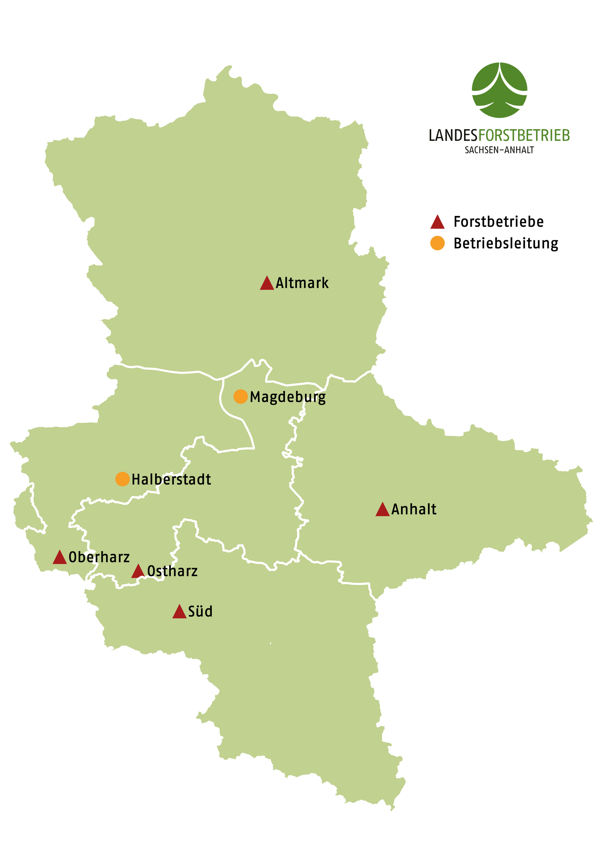 Die Landeswaldflächen erstrecken sich über ganz Sachsen-Anhalt - von Arendsee bis Zeitz und von Benneckenstein bis nach Annaburg. Als regionale Betriebsteile fungieren fünf Forstbetriebe: Die Forstbetriebe Altmark und Anhalt im Tiefland sowie die Forstbetriebe Oberharz, Ostharz und Süd im Berg- und Hügelland