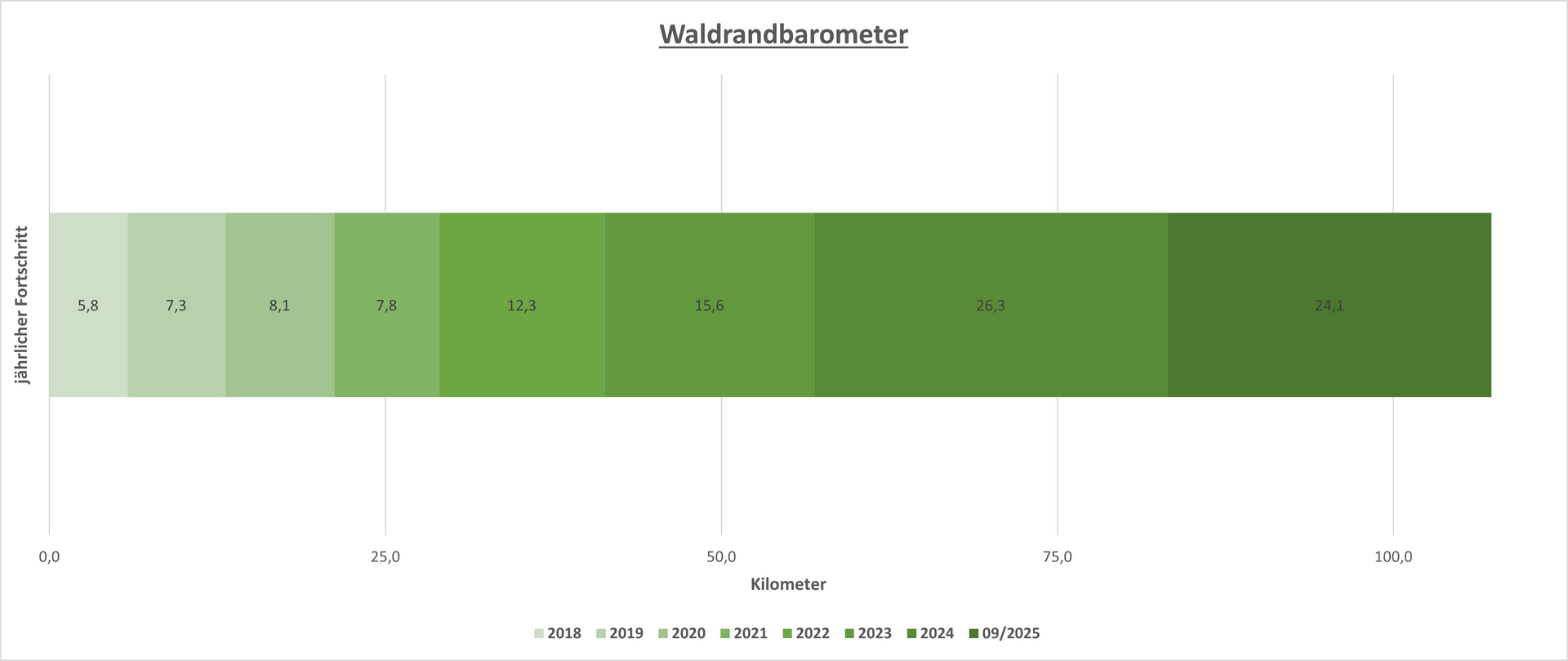 Um den Projektfortschritt sichtbar zu machen, haben wir ein Waldrandbarometer eingerichtet, das die Entwicklung hin zum 100-km-Ziel darstellt. Im Laufe des Jahres 2025 konnten wir dieses Ziel nicht nur erreichen, sondern sogar übertreffen! Doch damit ist unsere Arbeit nicht abgeschlossen: Die Pflege bestehender Waldränder und die Anlage neuer Abschnitte bleiben ein zentraler Bestandteil unserer Arbeit.